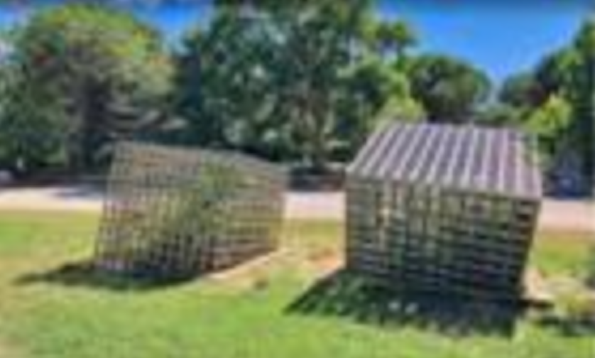 Vous prenez la première allée et on se retrouve devant l' installation présentant 2 cubes ajourés en métal.